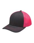 Adams Prodigy Meshback Cap. 100% Brushed cotton midweight twill crown. Matching color semi-flat under visor. Snap back plastic closure. Charcoal grey twill sweatband on all colors. Six panel, structured cap. Contrast back mesh panels and contrast color top stitching on visor. Two-tone charcoal front panels/visor.